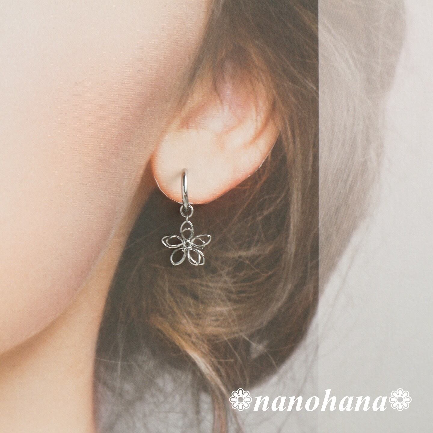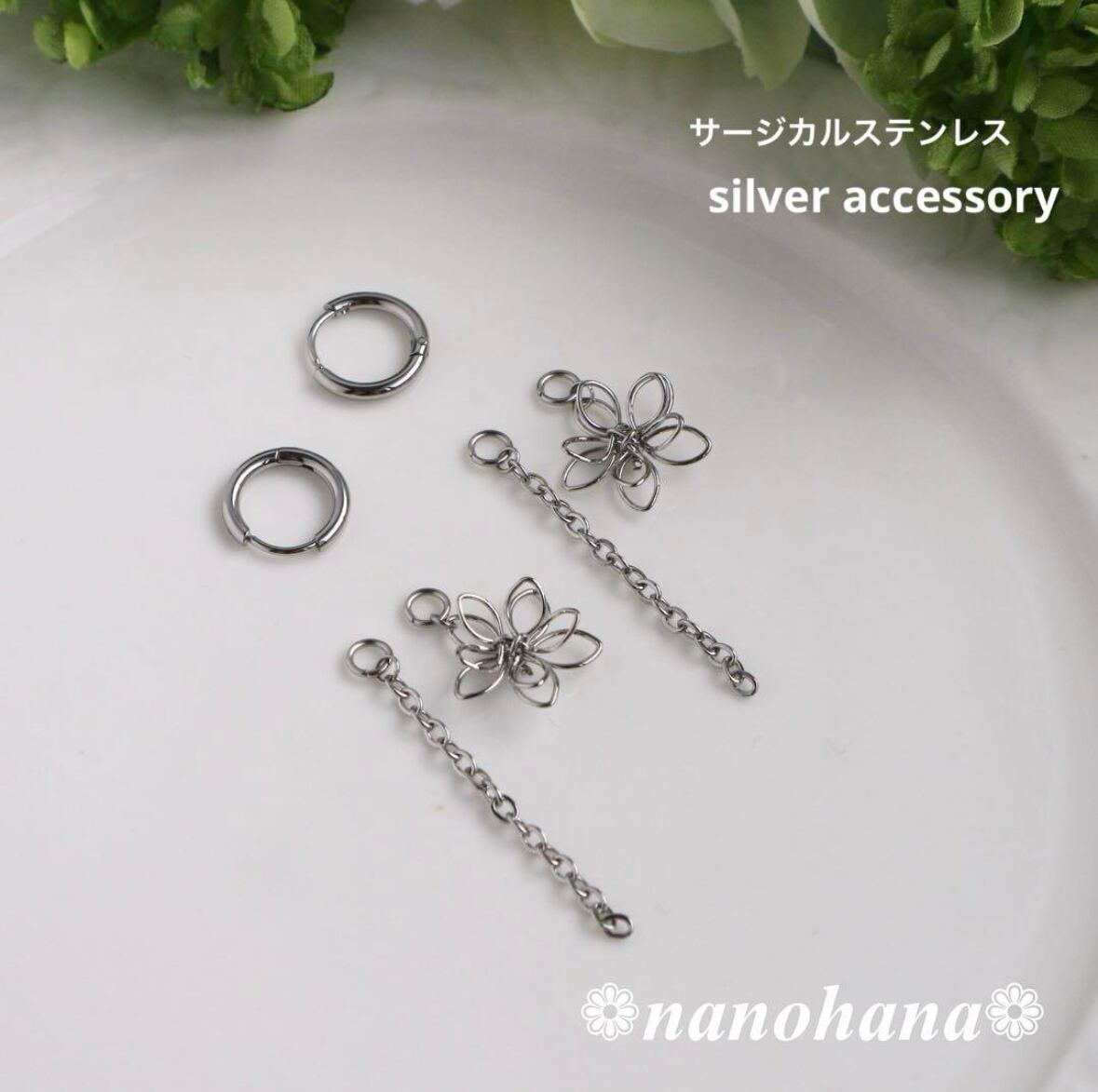シンプルながらも上品なデザインが魅力のシルバーフープピアスにフラワーチャームとチェーンをつけてお好みアレンジ可能です。
