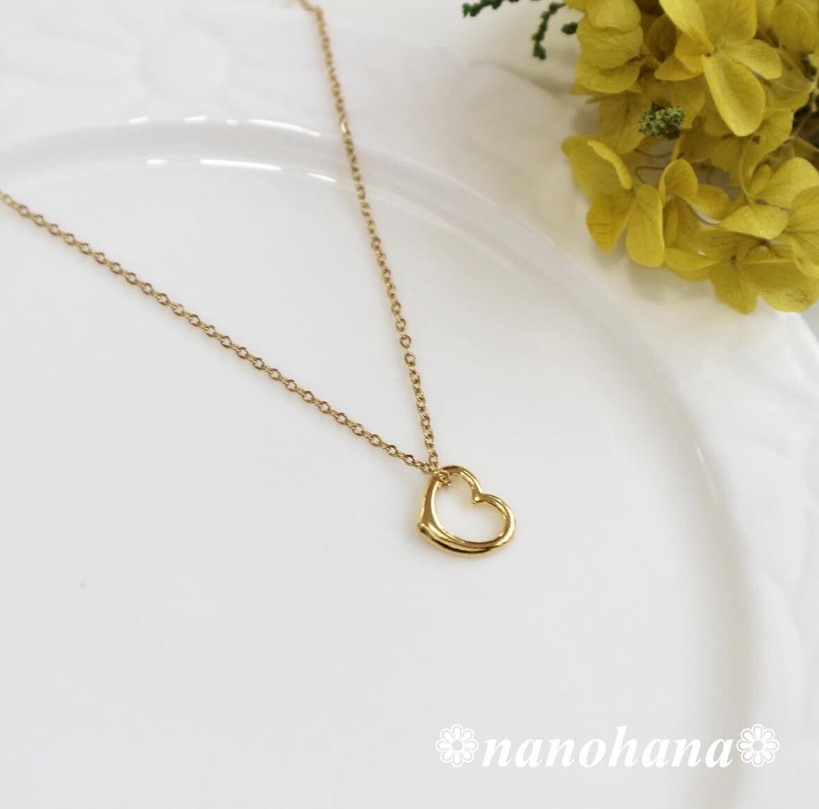 ころんと丸みのあるオープンハートが可憐に揺れる、シンプルなゴールドネックレス。