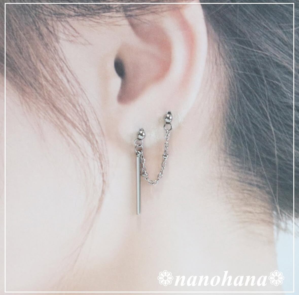 シルバー/2連ピアス/ボールチェーン/ミニスティック/サージカルステンレス/金属アレルギー対応