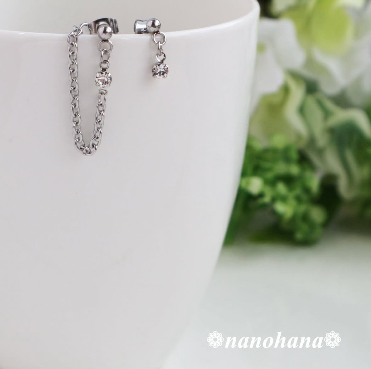 《 シンプルバックチェーンピアス・ラインストーン付シルバー》015(サージカルステンレス・アシンメトリー)