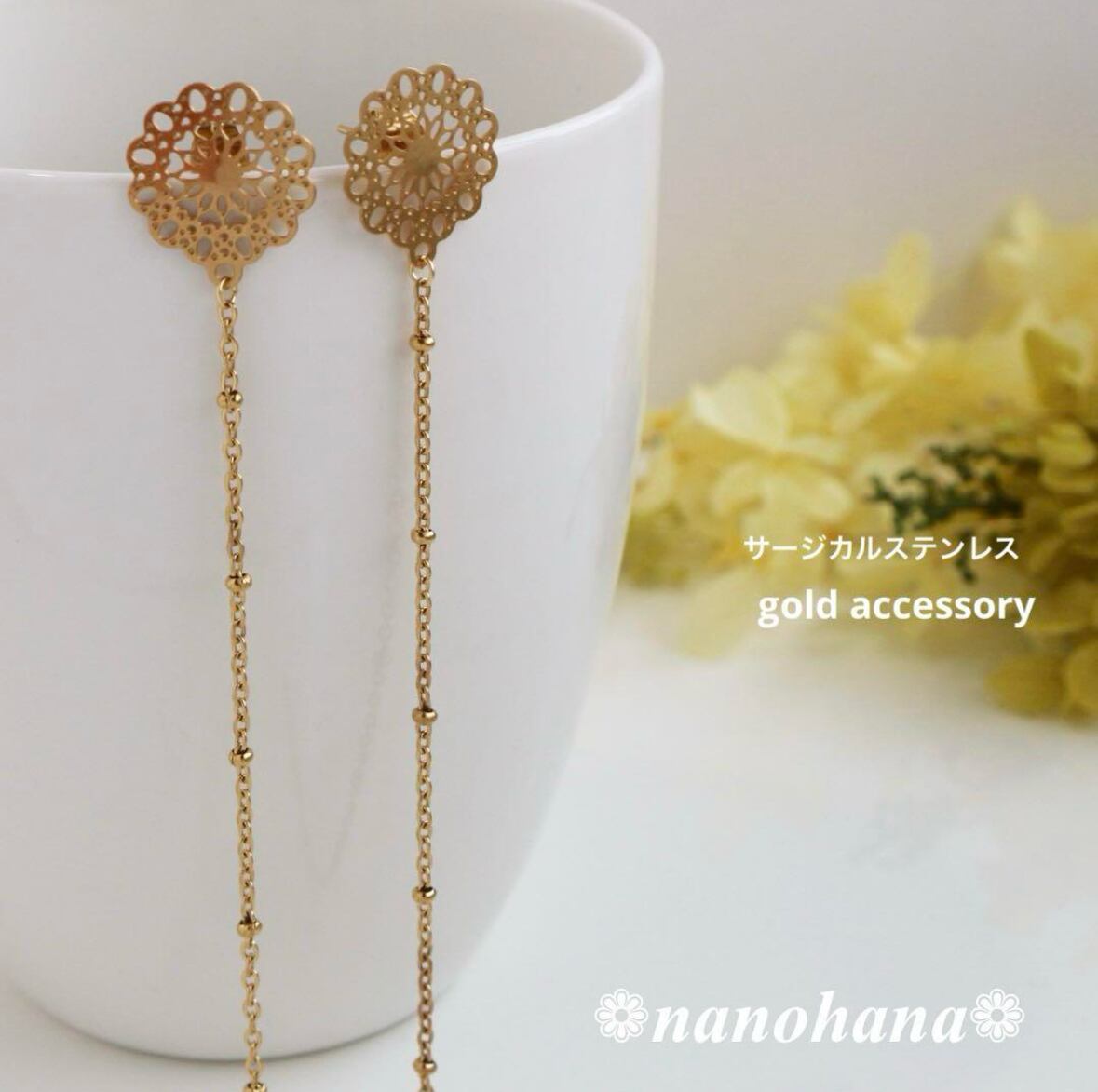 ゴールド/ロングチェーン/透かしデザインピアス/オールサージカルステンレス