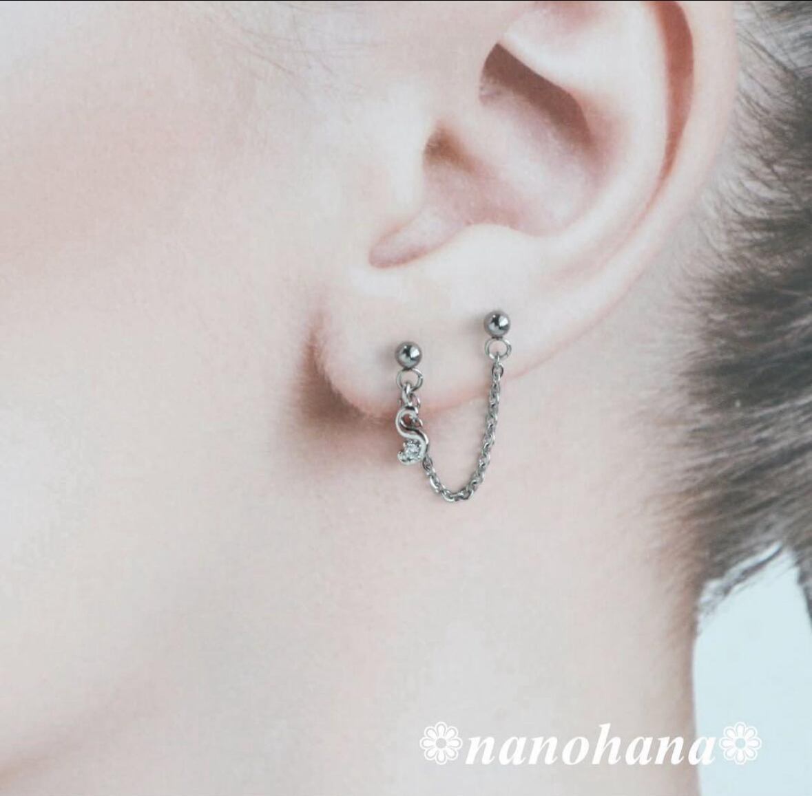 Exclusive item|✴︎ シンプル&アクセント、さりげなく個性を ✴︎ 《 ジルコニア付きシルバー2連短チェーンピアス 》K①(サージカルステンレス・片耳用)【訳あり特価】 | nanohana