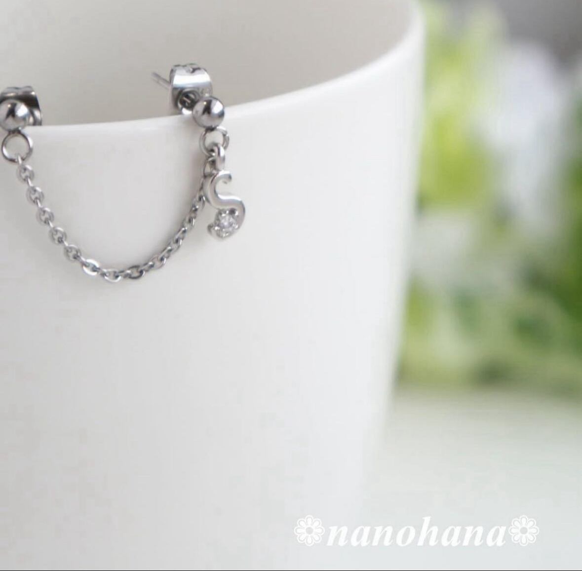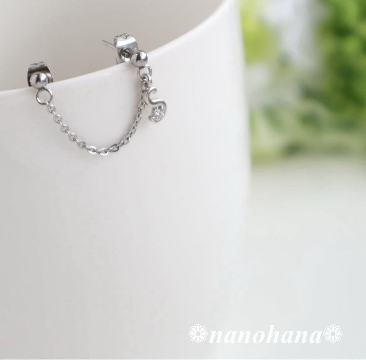 ジルコニアがさりげなく輝く「S」チャームと短めチェーンが耳元で揺れる、片耳用のシンプルな2連チェーンピアス。