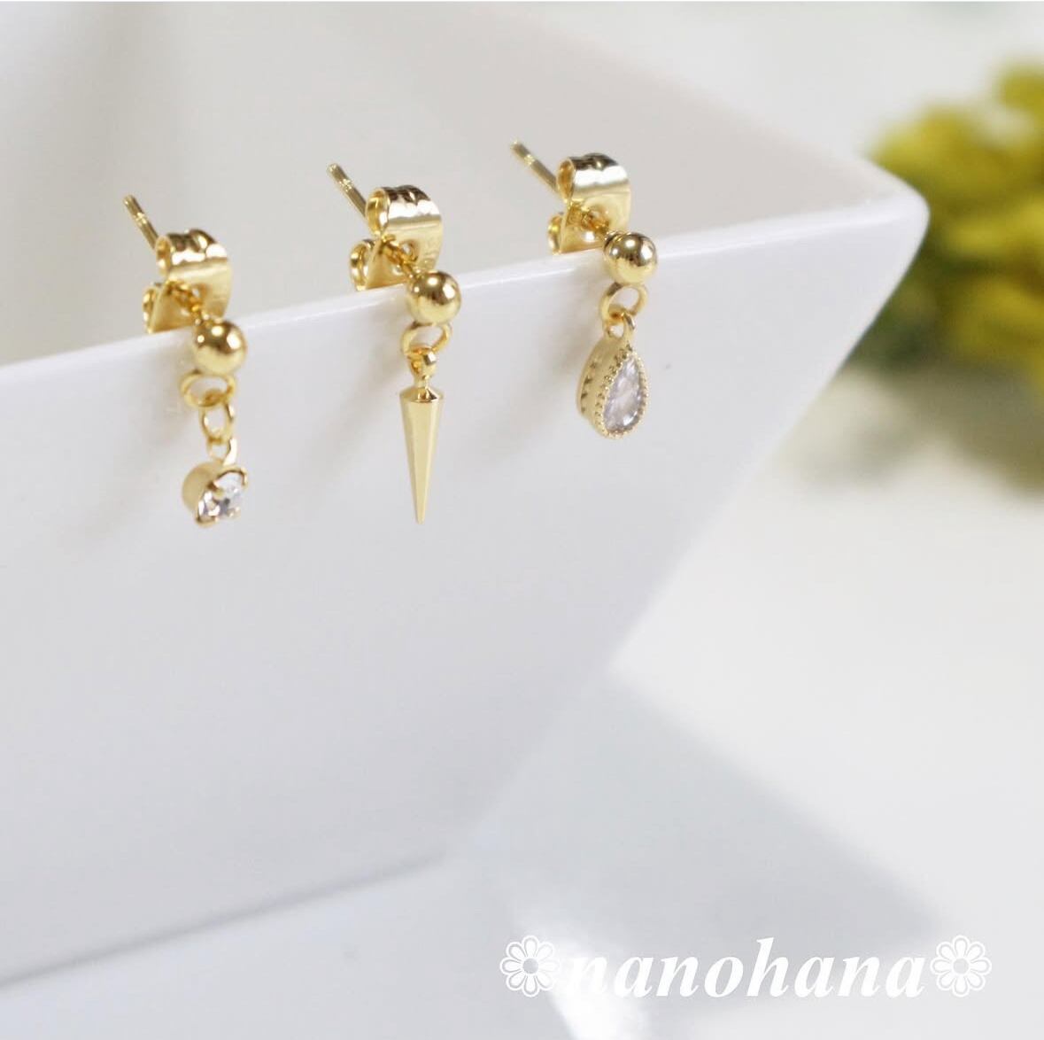 このアクセサリーは、肌に触れるピアス金具やキャッチにサージカルステンレス製のゴールドパーツを使用しています。