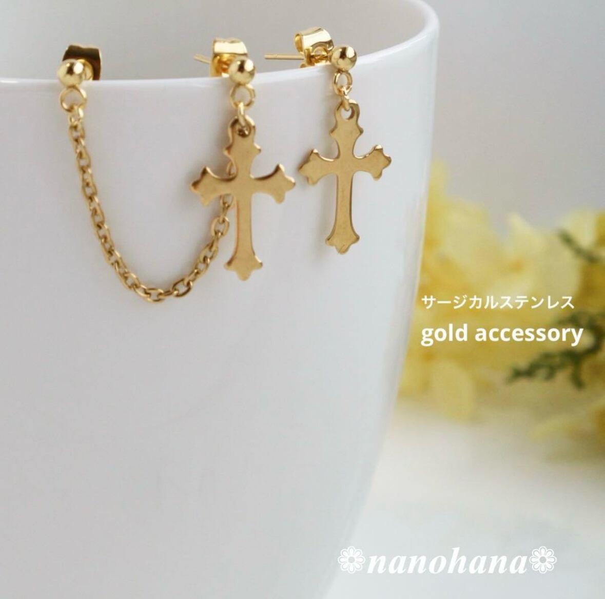 《 クロスシンプルチェーン2連ピアス・ゴールド 》499(オールサージカルステンレス/2連チェーン)