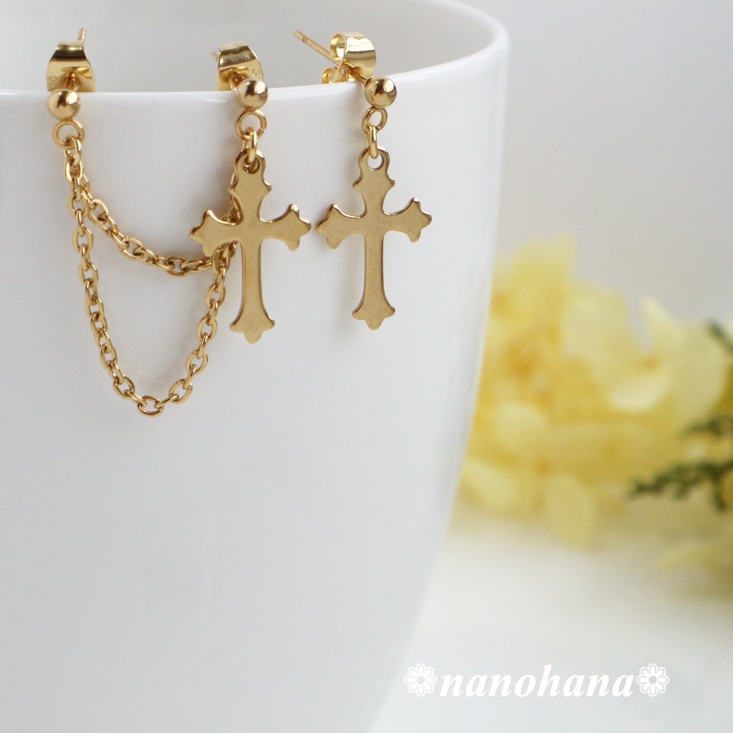 チェーンの軽やかな動きとクロスの輝きが、耳元を上品に飾ります。