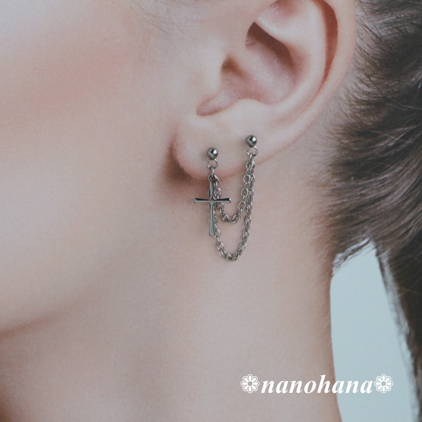 きらりと揺れるクロスモチーフが印象的な、2連チェーンピアス。