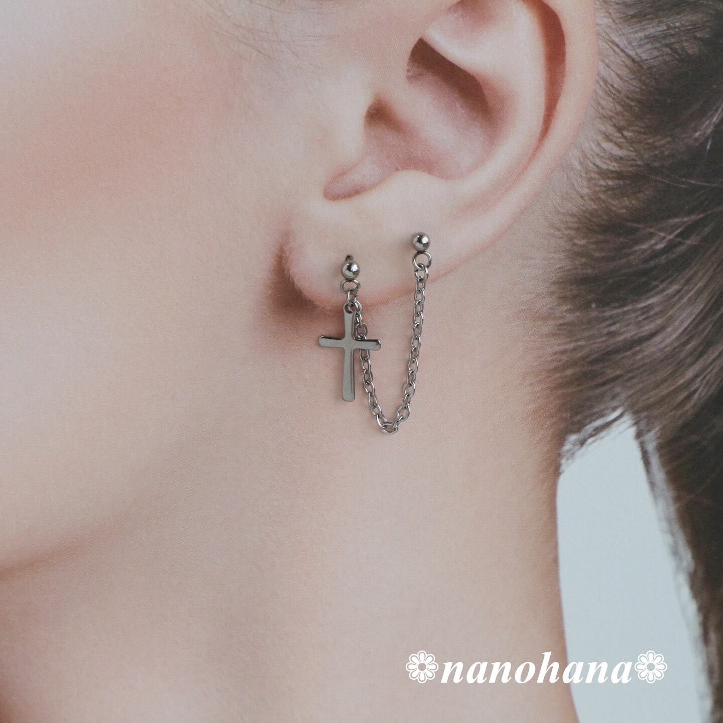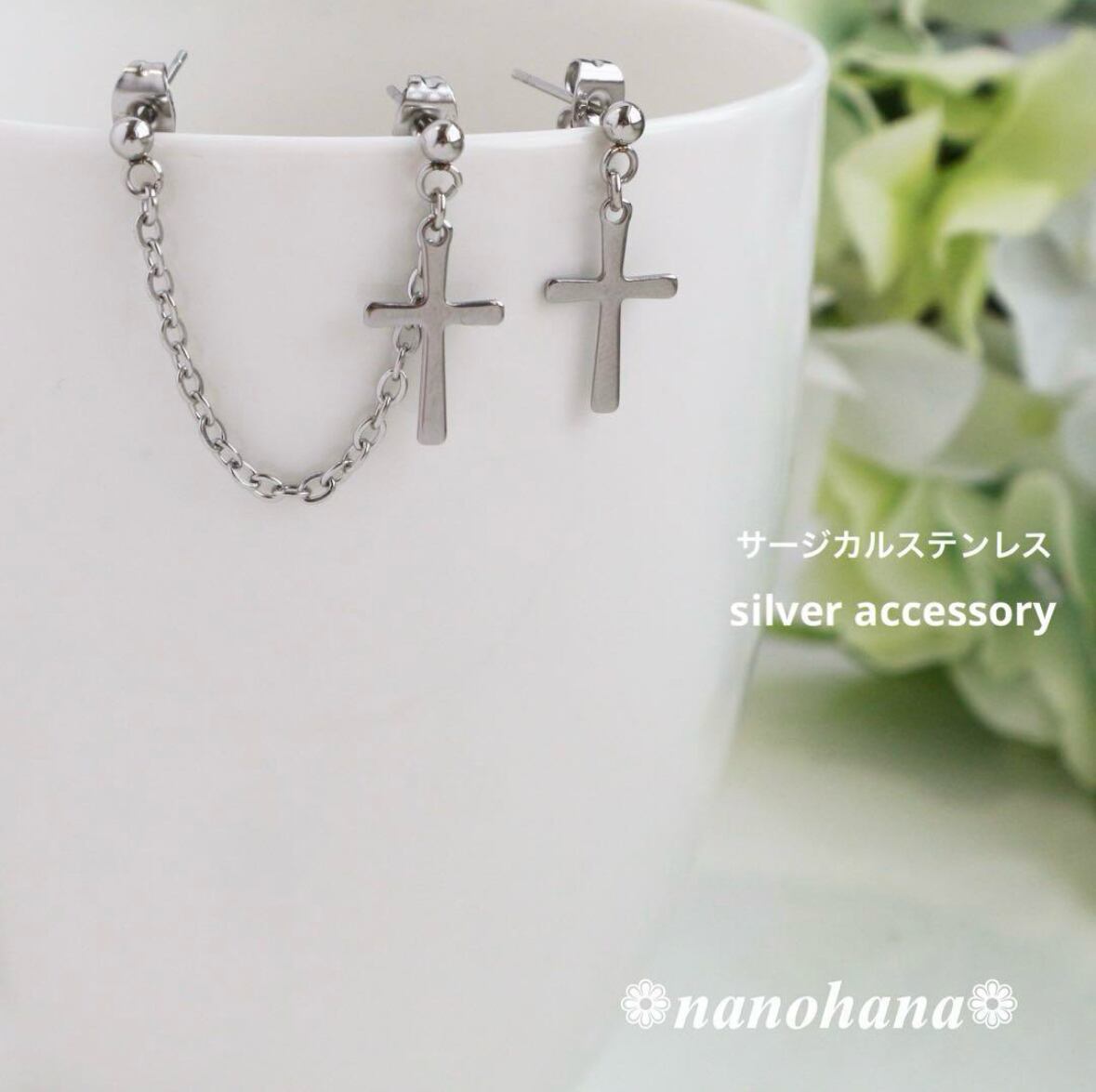 《 クロスシンプルチェーン2連ピアス・シルバー 》499(オールサージカルステンレス/2連チェーン・2穴片耳用)