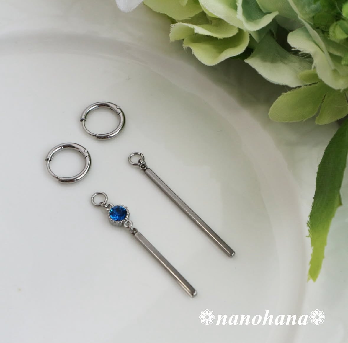 シンプルなフープに、スティックパーツを付け替えて楽しめる2wayピアスセット。