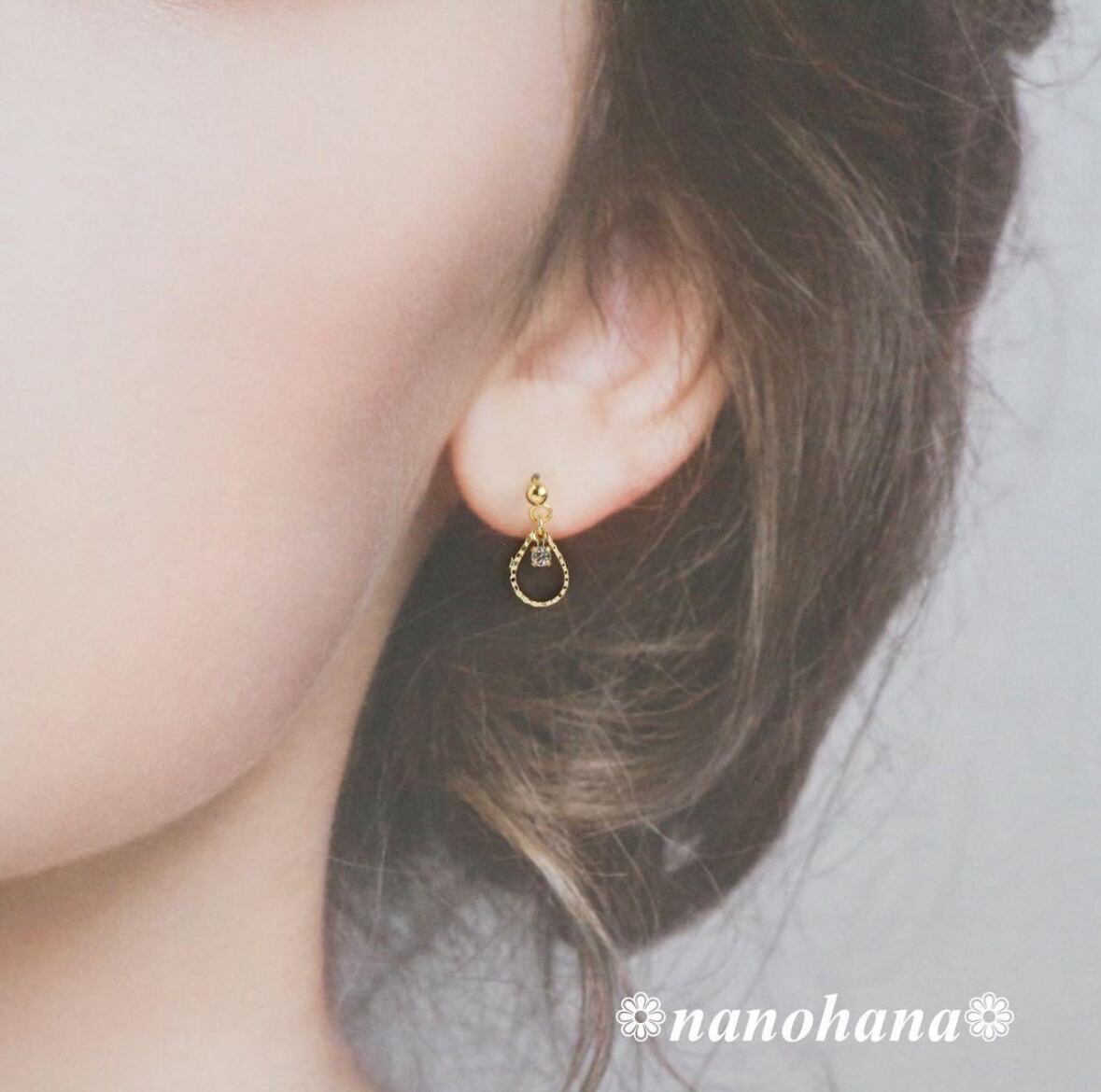 小さな雫型パーツに片方だけラインストーンをあしらった、さりげなく遊び心のあるアシンメトリーデザイン。
