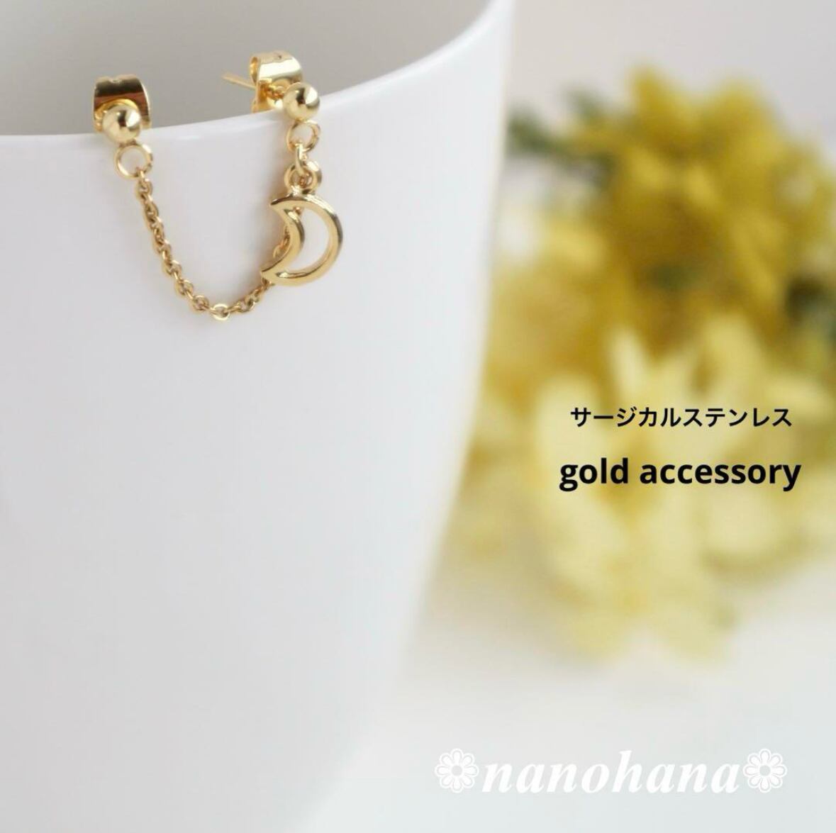 このアクセサリーは、肌に触れるピアスポスト・キャッチ・チェーン部分にサージカルステンレス製のゴールドパーツを使用しています。