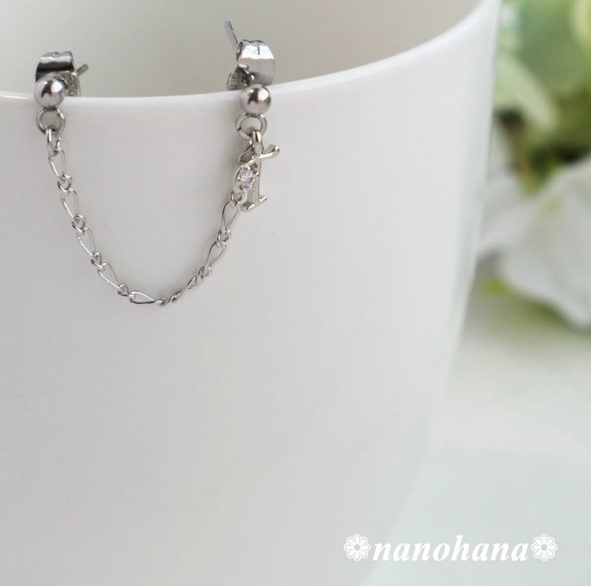 《 ジルコニア付イニシャルT 2連チェーンピアス 》294(サージカルステンレス/2穴片耳用)