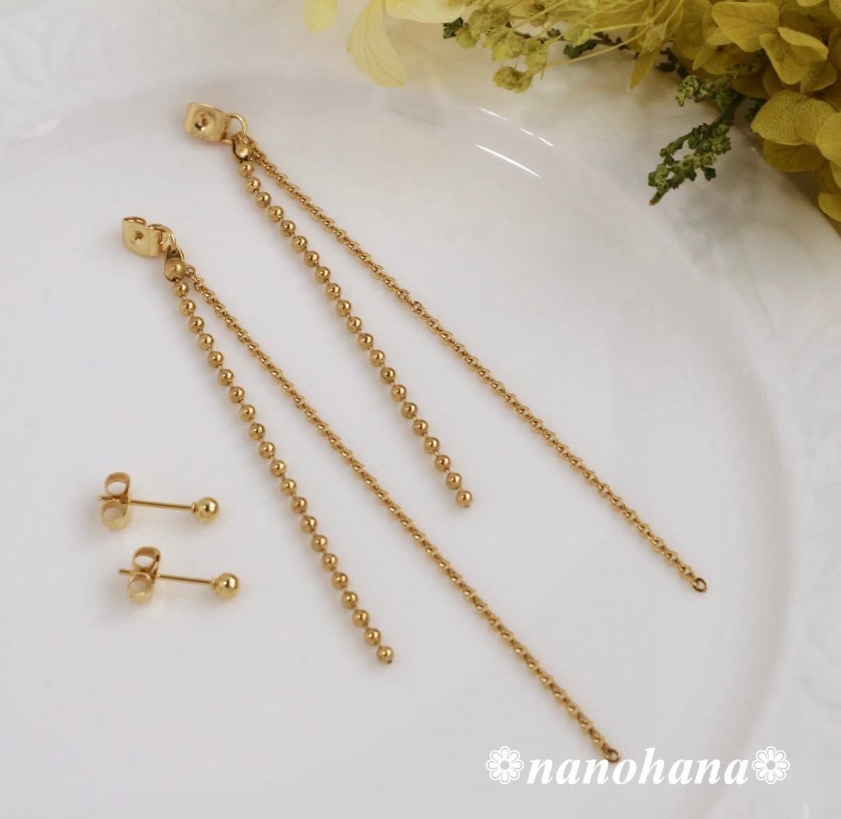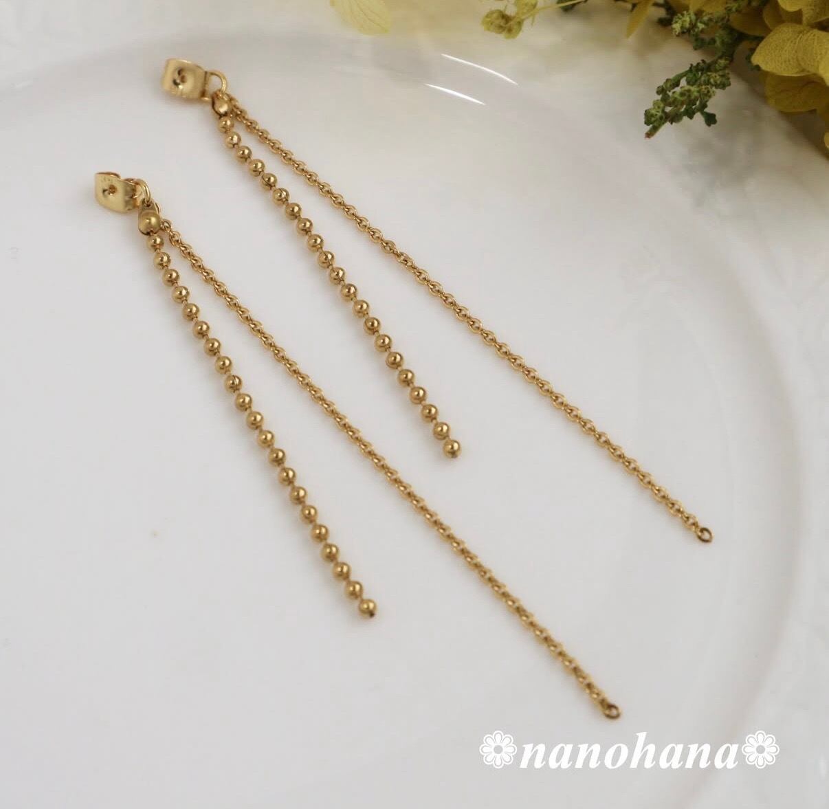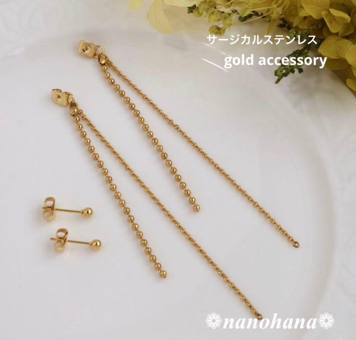 このアクセサリーは、肌に触れるチェーンやキャッチピアス金具などすべてにサージカルステンレス製のゴールドパーツを使用しています。