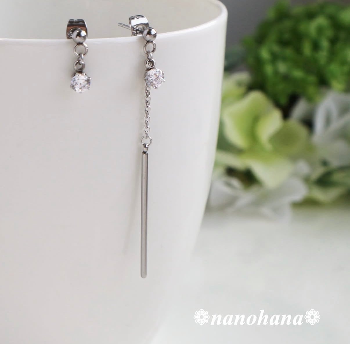 透明感のあるジルコニアの輝きと、すっきりと揺れるスティックを組み合わせた洗練されたアシンメトリーデザインのピアス。