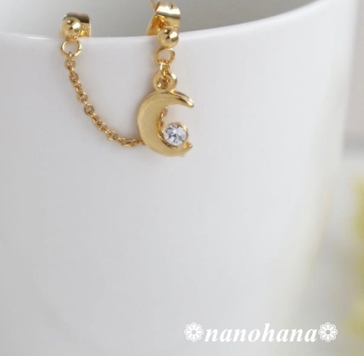 シンプルながらも月モチーフのきらめきが印象的で、横顔にそっと華やぎを添えます。