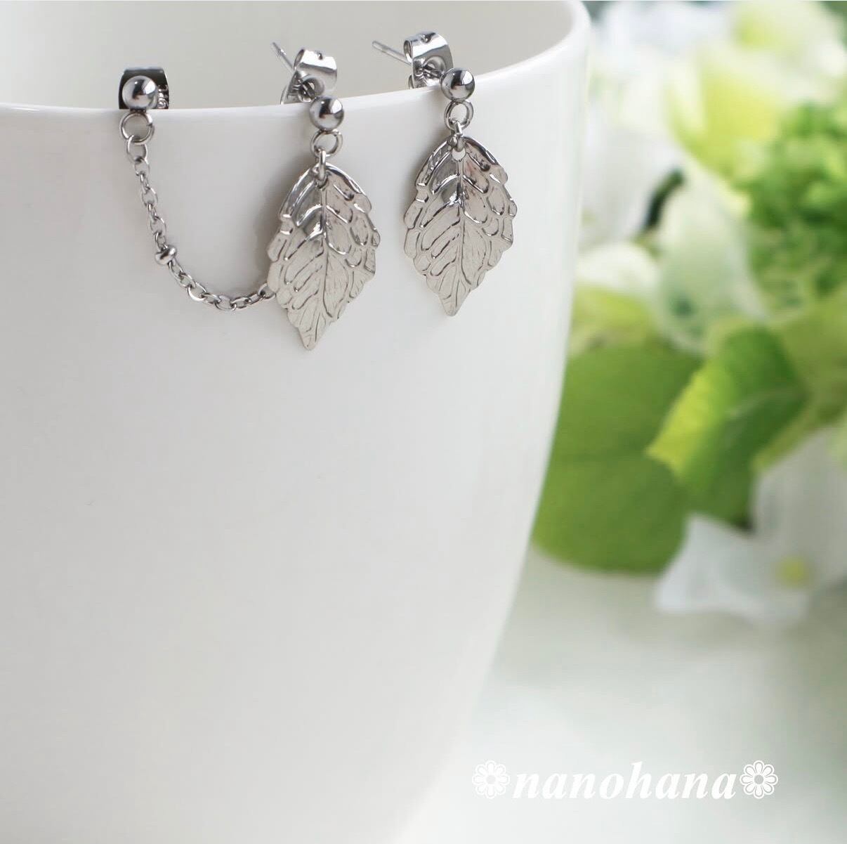 シルバー/サージカルステンレス/リーフ/2連ピアス/揺れるピアス
