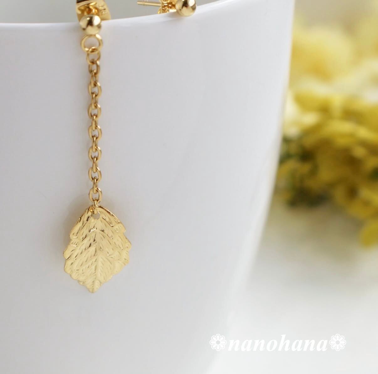 チェーンの先で揺れるリーフモチーフと、ミニボールのピアスを組み合わせたアシンメトリーデザイン。