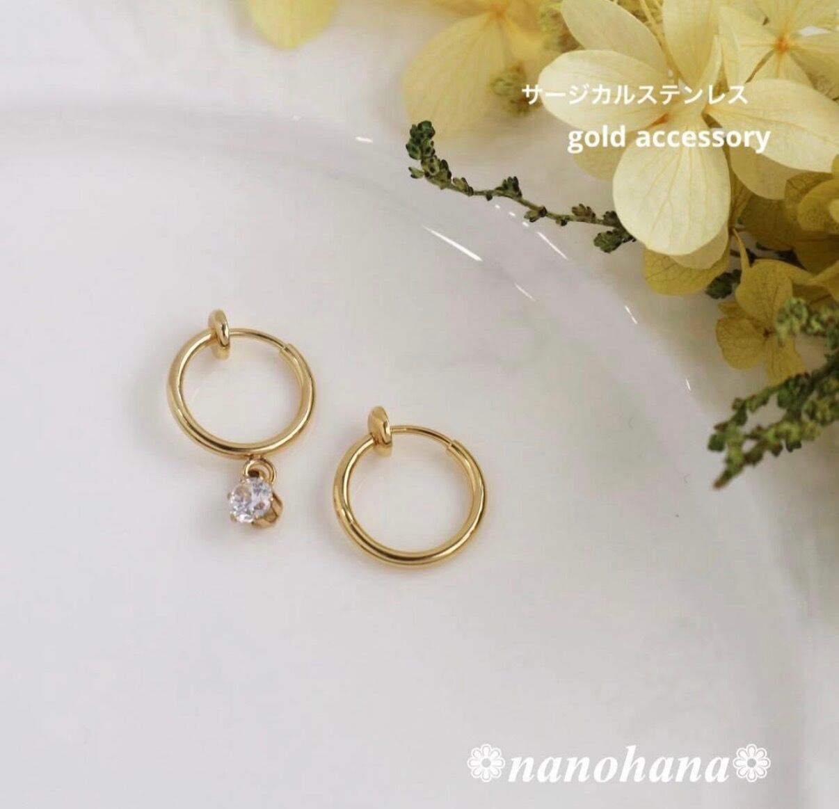 このアクセサリーは、耳に触れる部分にサージカルステンレス製のゴールドパーツを使用しています。