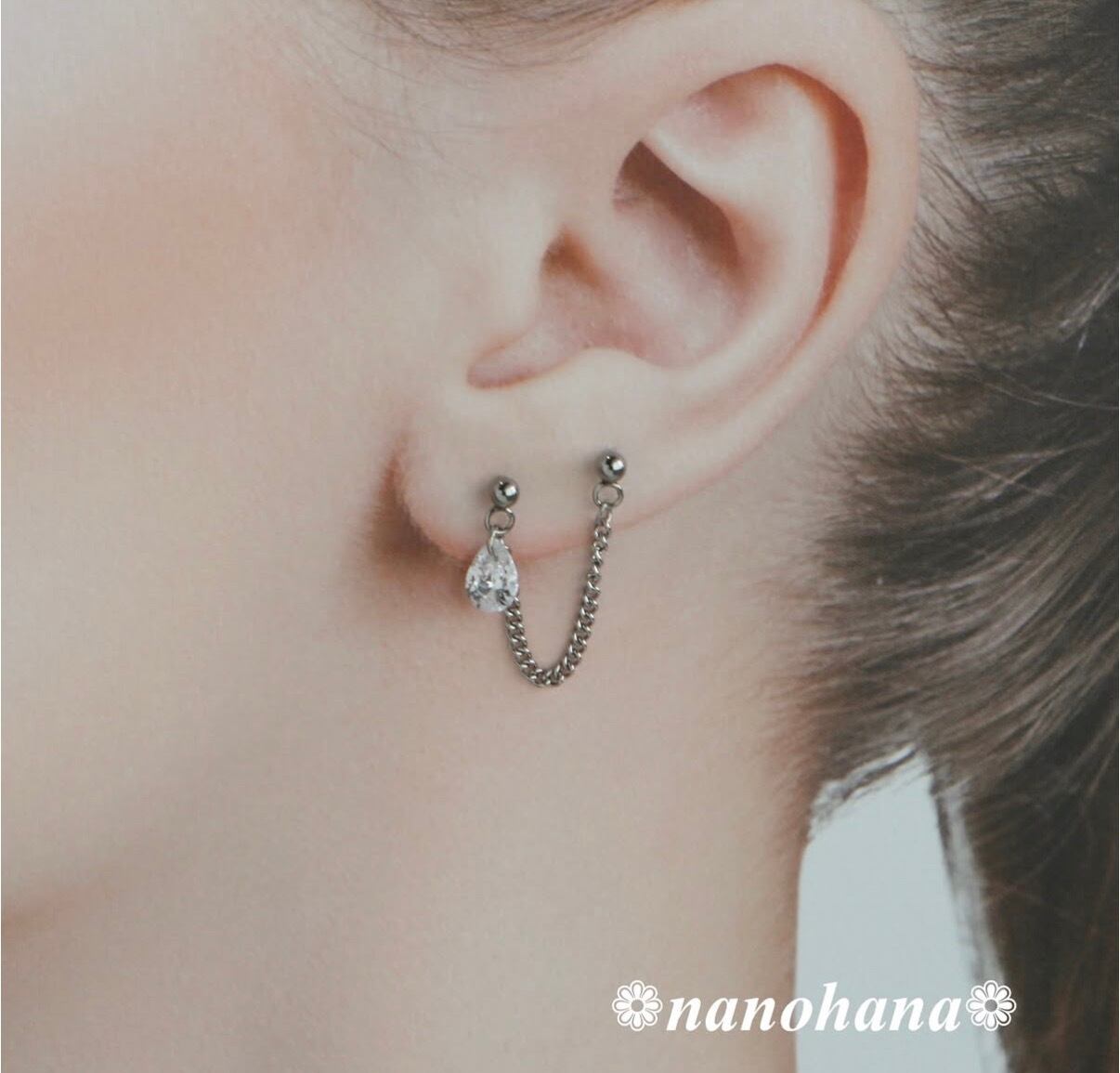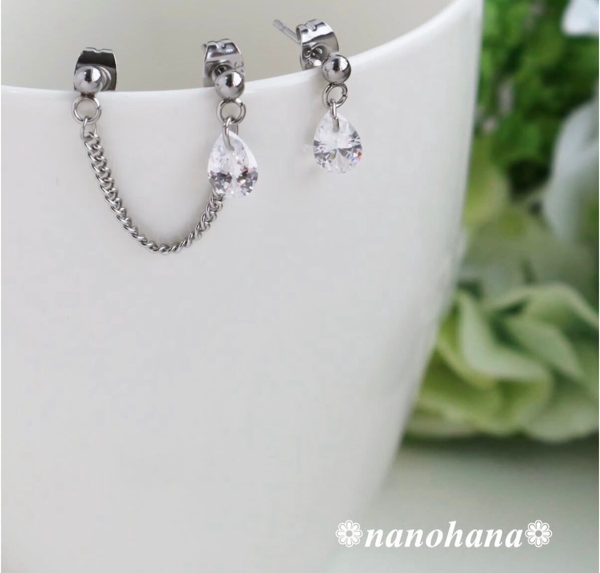 ✴︎ きらりと揺れる雫とチェーン ✴︎ 《 大粒ジルコニアドロップ付チェーン2連ピアス・シルバー 》515(サージカルステンレス)