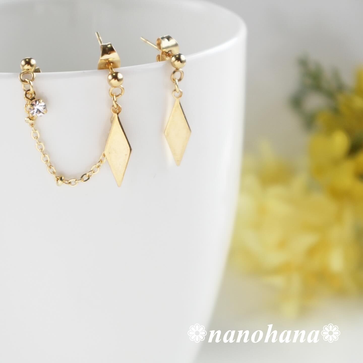 《ミニひし形チェーン2連ピアス・ゴールド》162サージカルステンレス