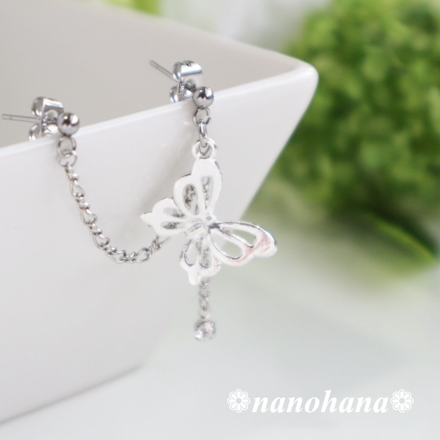 《バタフライ2連チェーンピアス・シルバー 》181サージカルステンレス 片耳用
