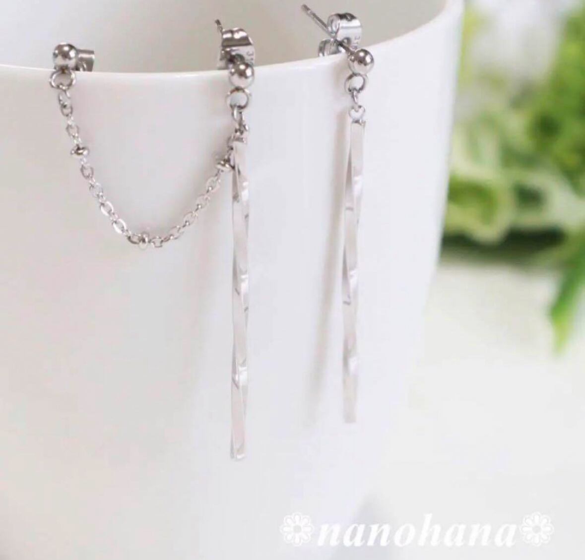 デザインカットされたツイストスティックの輝きが綺麗なシンプル2連チェーンピアスです。