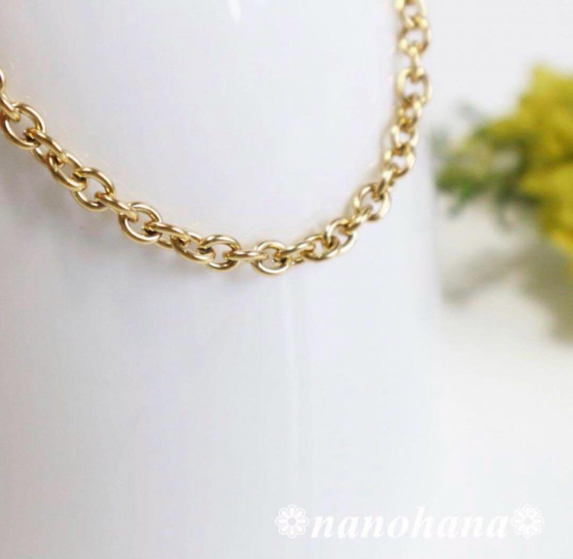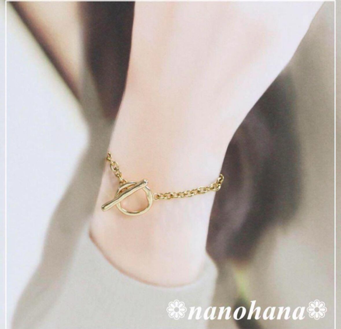 サージカルステンレスチェーンを使ったブレスレットです。シンプルでありながらもエレガントな印象を持つゴールドブレスレットで、どんなスタイルにも馴染むアクセサリーです。マンテルデザインが手元を華やかに彩り、特別な日のおしゃれはもちろん、日常使いにもぴったりです。