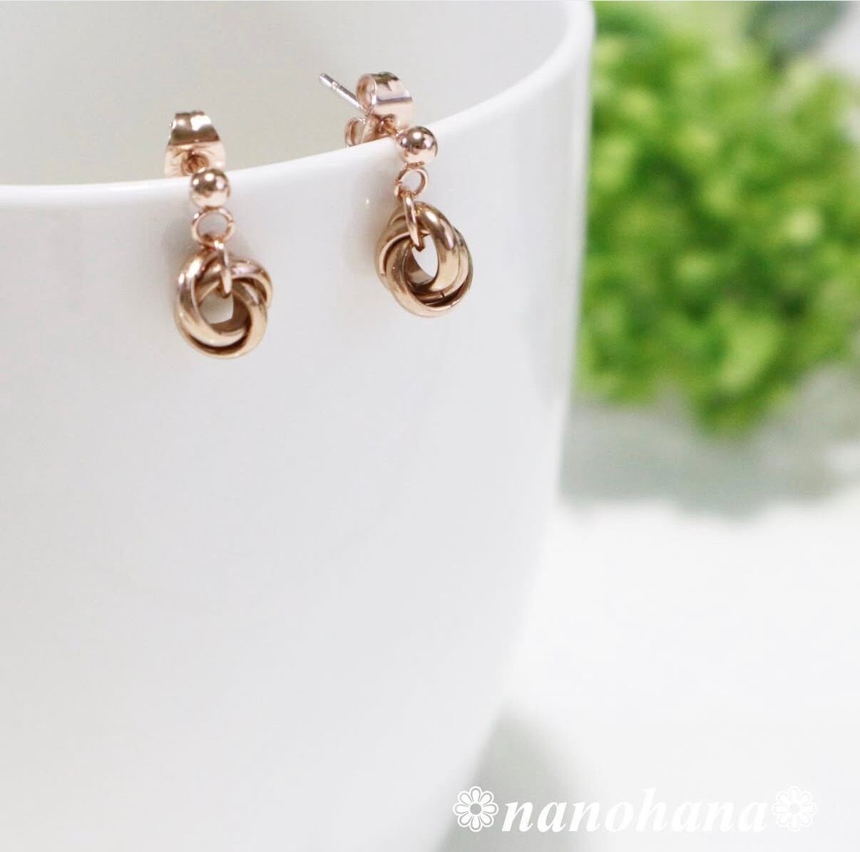 このアクセサリーは、肌に触れるピアス金具やパーツにサージカルステンレス製のゴールドカラー(ピンクゴールド)パーツを使用しています。