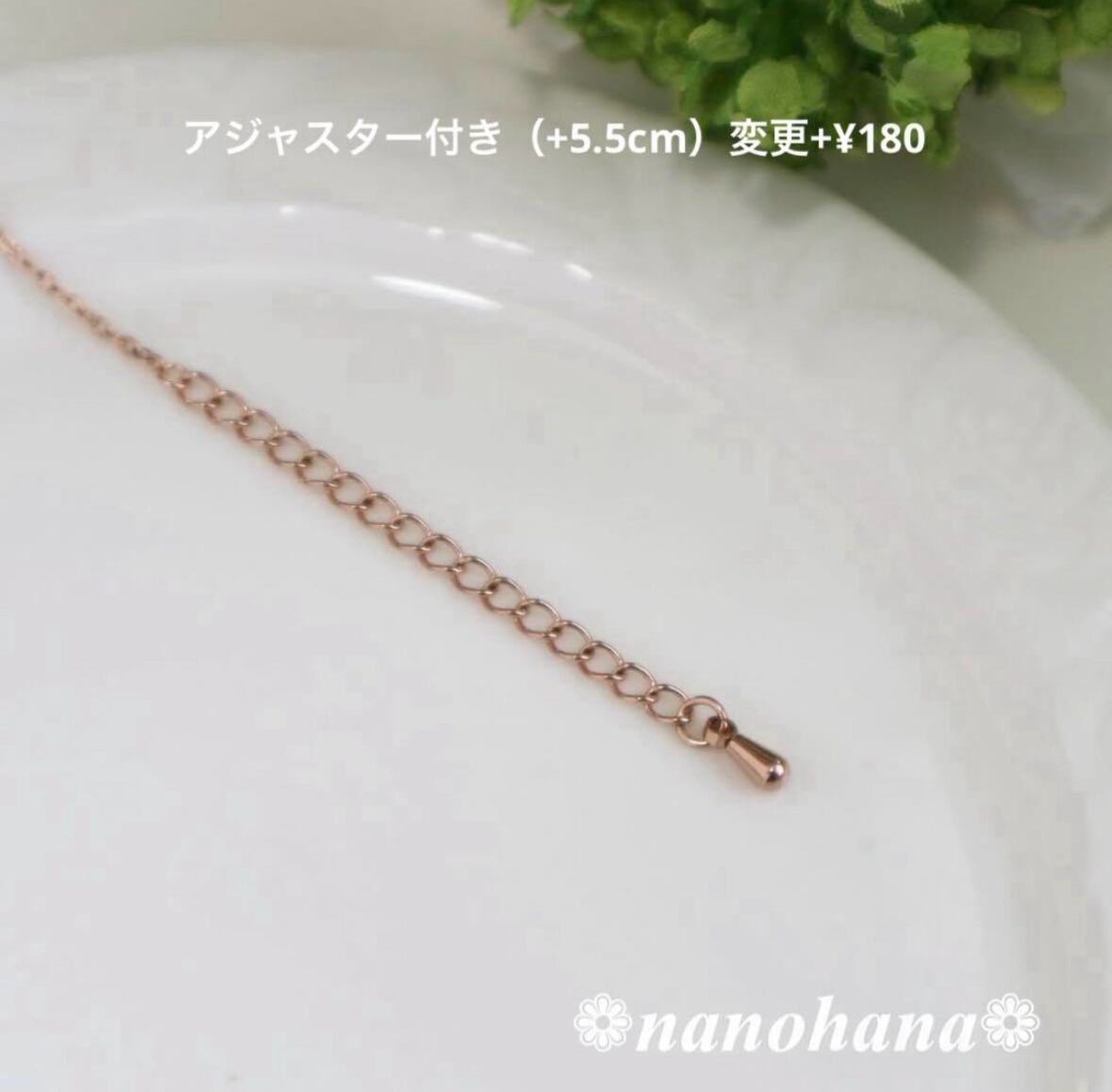 このアクセサリーは、肌に触れるチェーンや留め具などにサージカルステンレス製のピンクゴールドパーツを使用しています。
