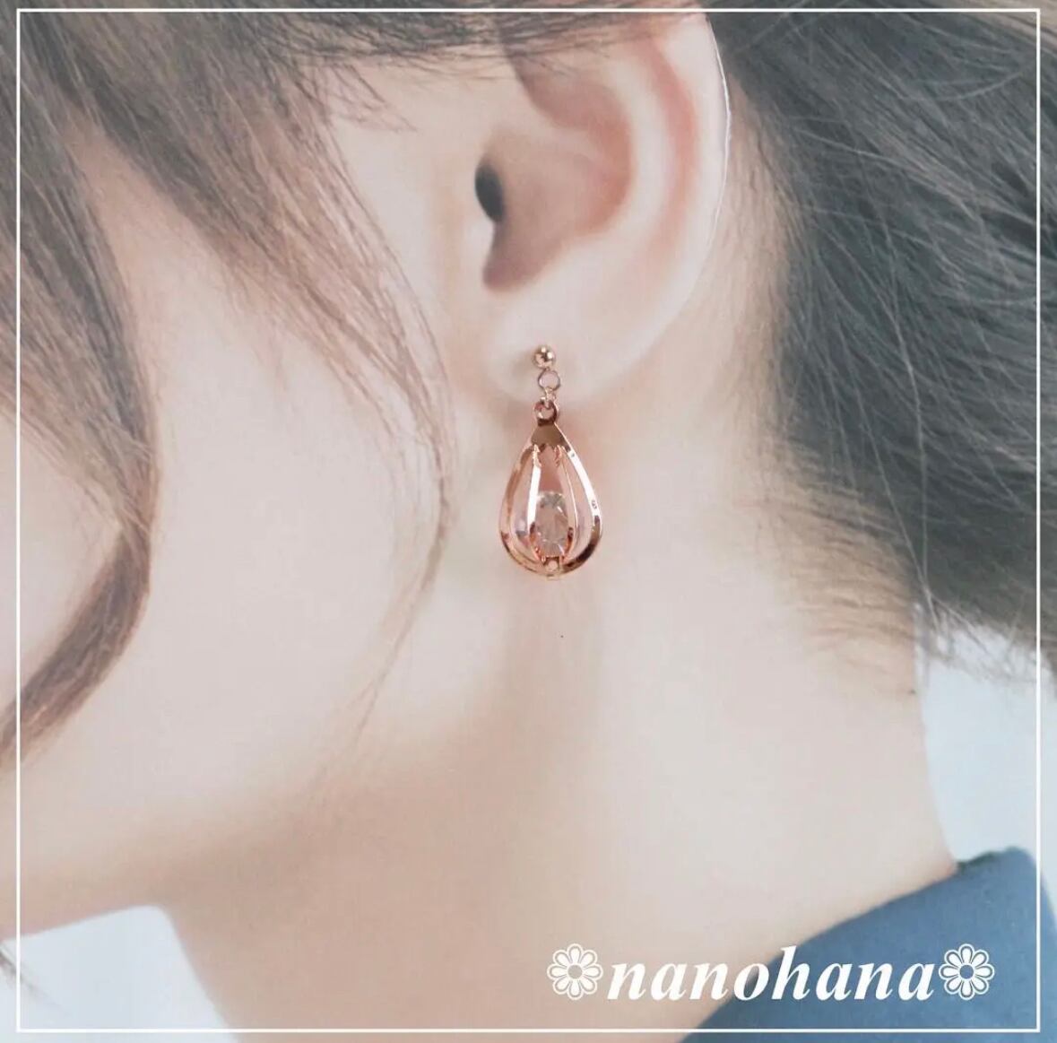 ピンクゴールドの質感と、大粒のストーンが耳元を華やかにしてくれるアクセサリーです。また、ドロップ型のデザインが女性らしさを引き出し、さりげなく耳元を飾ります。