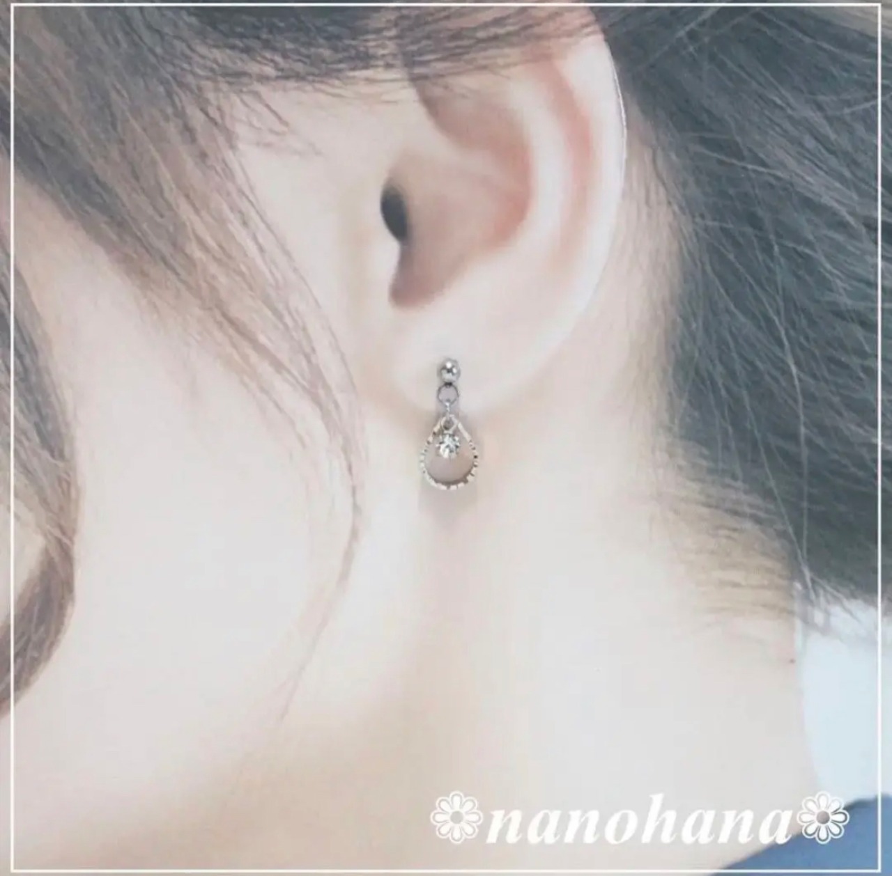 上品で華やかなデザインでありながら、シンプルなのでどんなコーディネートにも合わせやすいのが嬉しいポイントです。耳元で揺れる小さなドロップと、細かなラインストーンが重なり合った小さくて可愛らしいアクセサリーです。