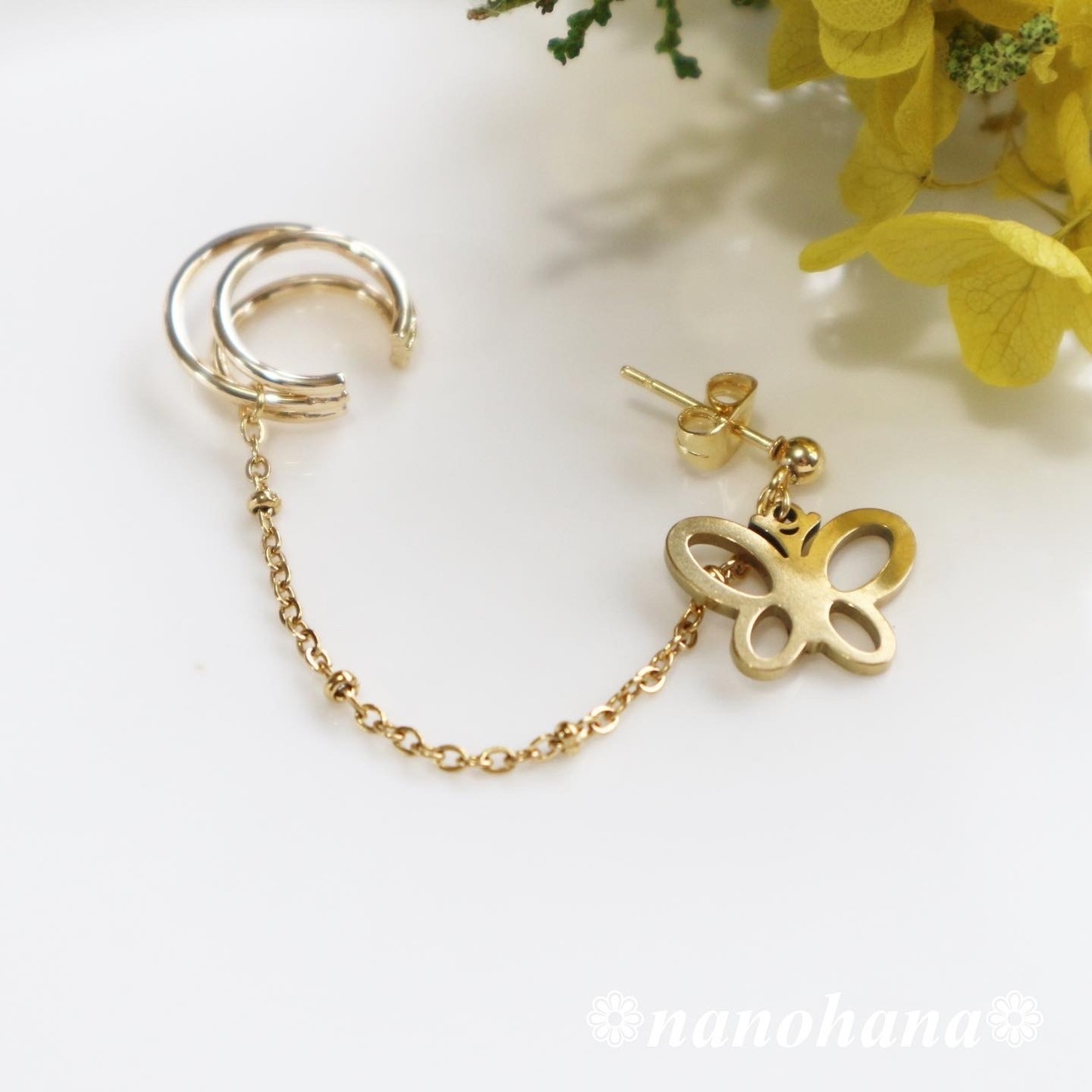 《バタフライピアス・イヤーカフ付ゴールド 》706サージカルステンレス