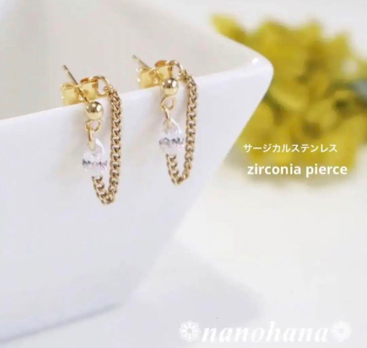 金属アレルギーの方でもお使いいただけるようジルコニア以外全てのパーツ、金具等サージカルステンレス素材を使ったピアスです。
