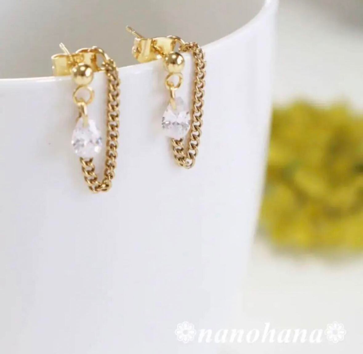 《 ジルコニアドロップ付バック短チェーンピアス・ゴールド》511オールサージカルステンレス