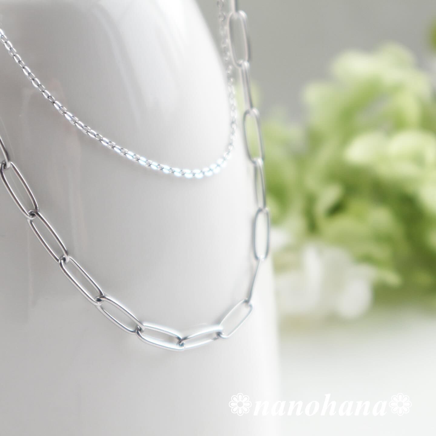 オーバルとあずきの2種類のサージカルステンレスチェーンをつかったネックレスです。