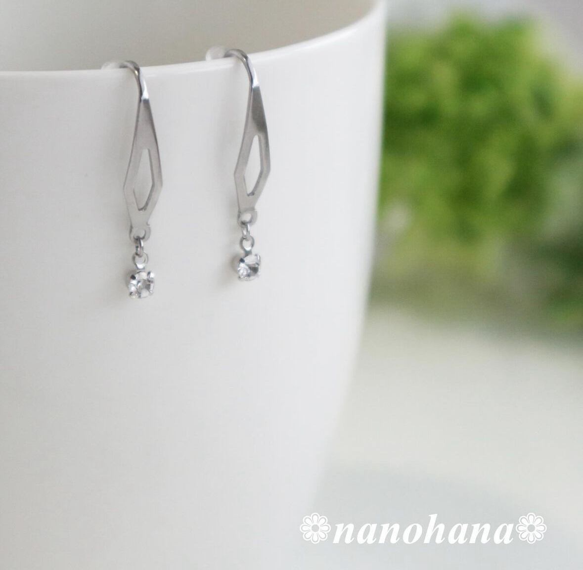 金属アレルギーの方でも安心してお使いいただけるようサージカルステンレス素材のデザインフックピアスをつかったアクセサリーです。