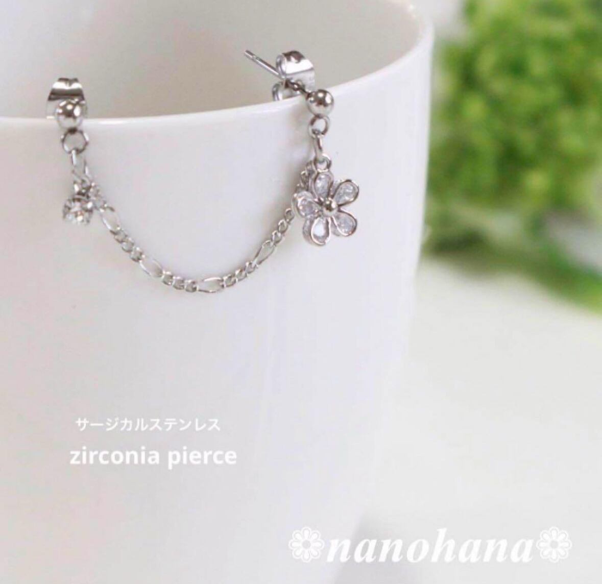 《ジルコニアフラワー2連チェーンピアス・シルバー 》338サージカルステンレス 両耳用