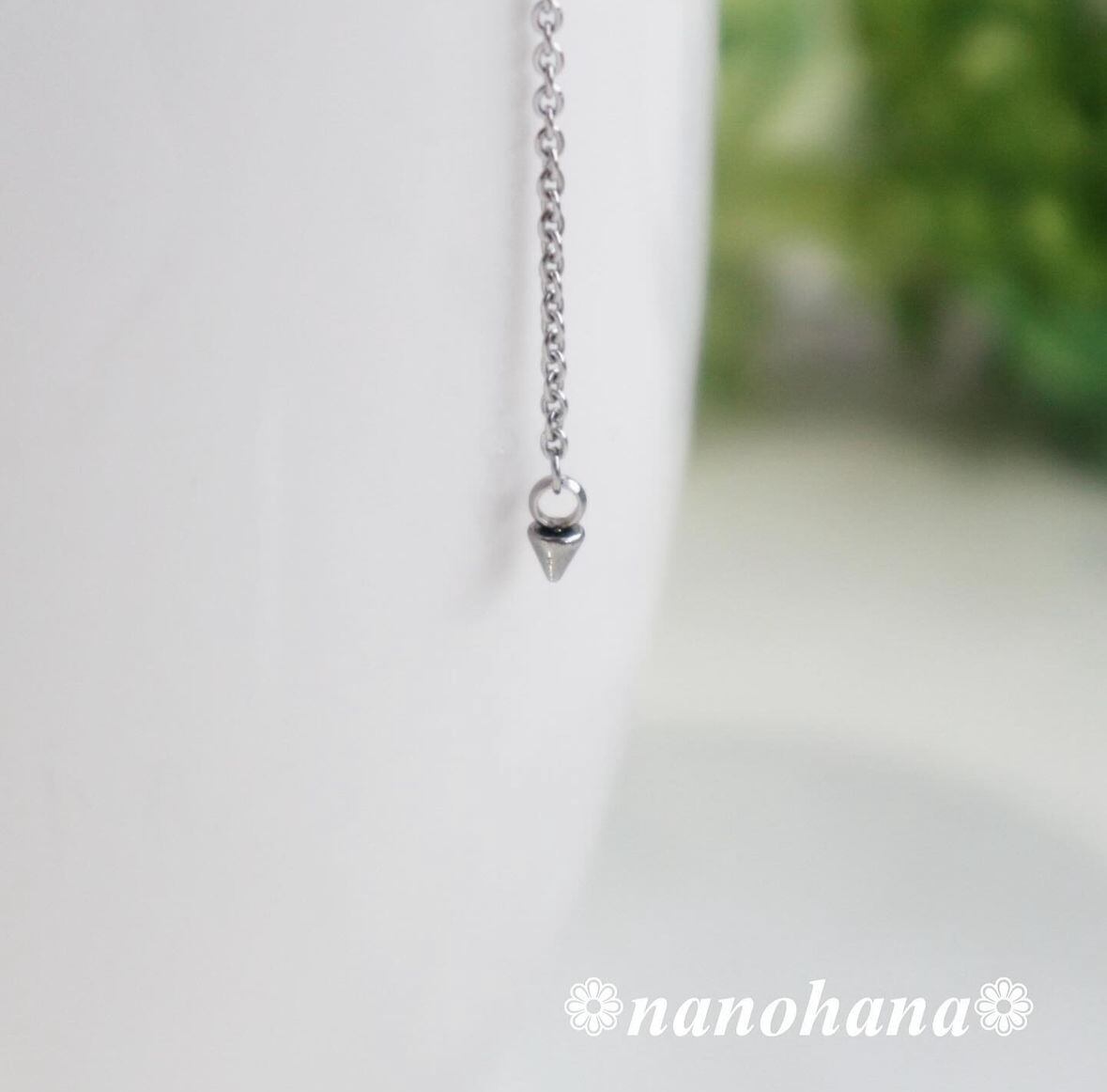 小さなコーンパーツとチェーンを使ったシンプルピアスです。軽やかなチェーンが揺れるたびに、華やかな印象を与えてくれるカッコ可愛いアクセサリーです。