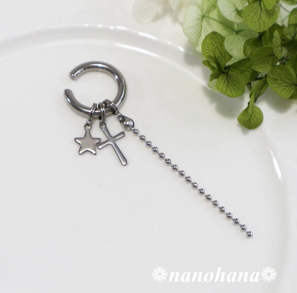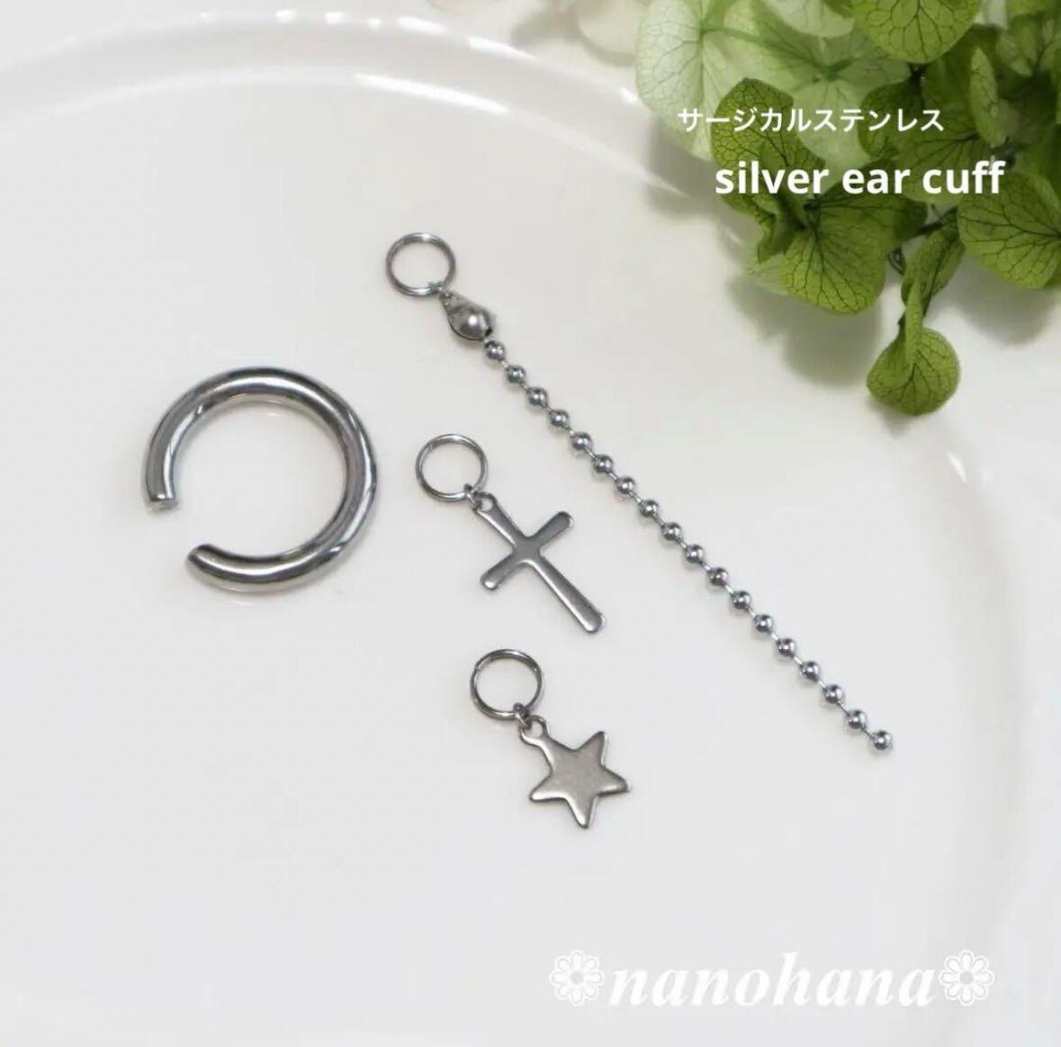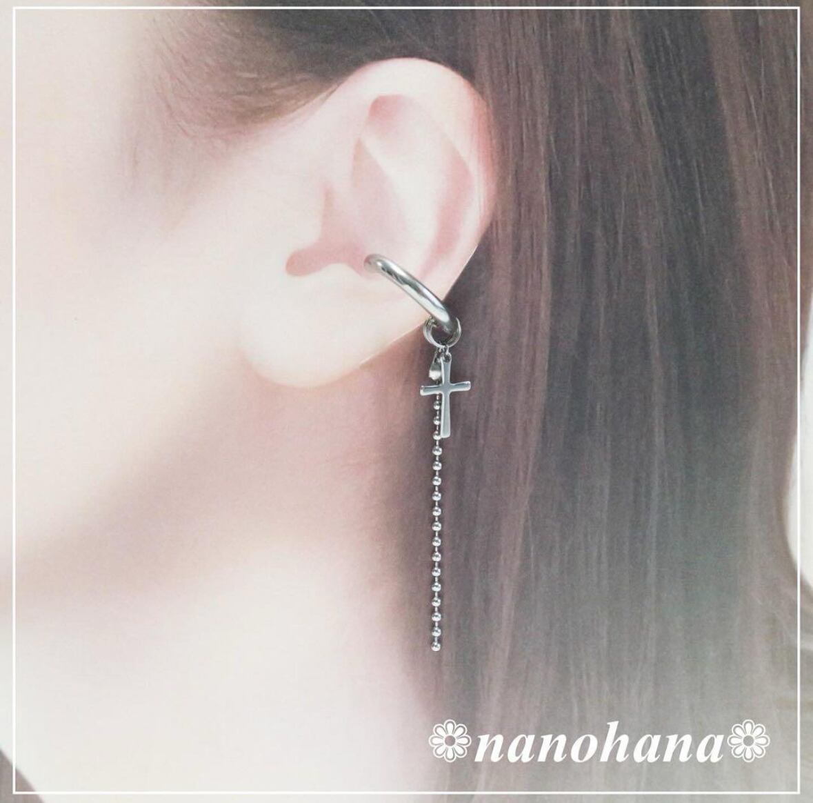 金属アレルギーの方でもお使いいただけるよう全てのパーツ、金具等サージカルステンレス素材を使ったイヤーカフです。