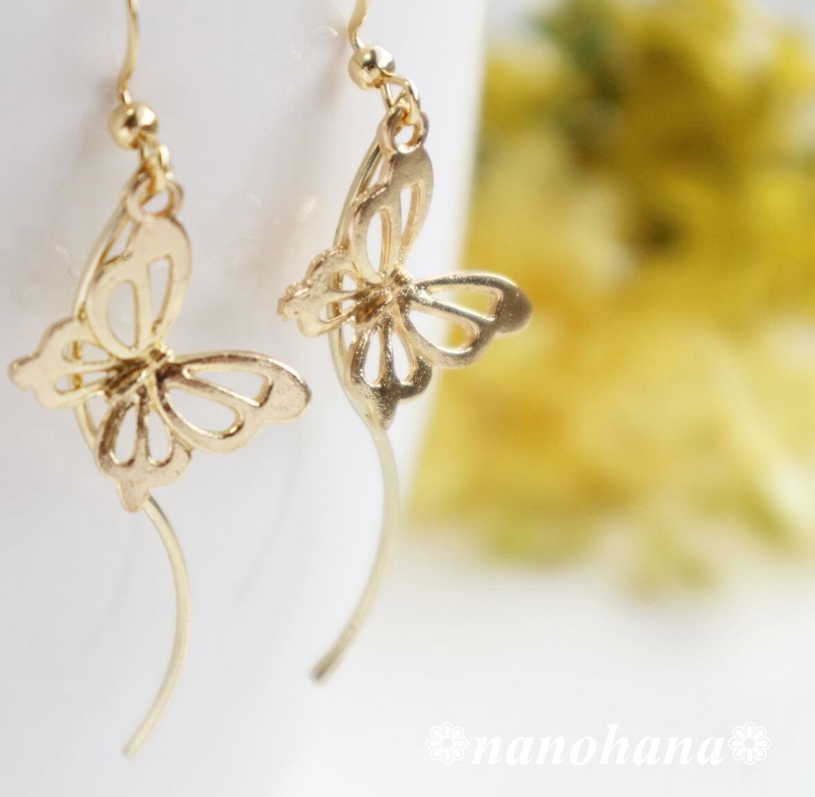 バタフライのデザインが特徴のピアスです。ツイストパーツとフックピアスが耳元に動きを与え、シンプルながらも華やかな可愛らしいアクセサリーです。