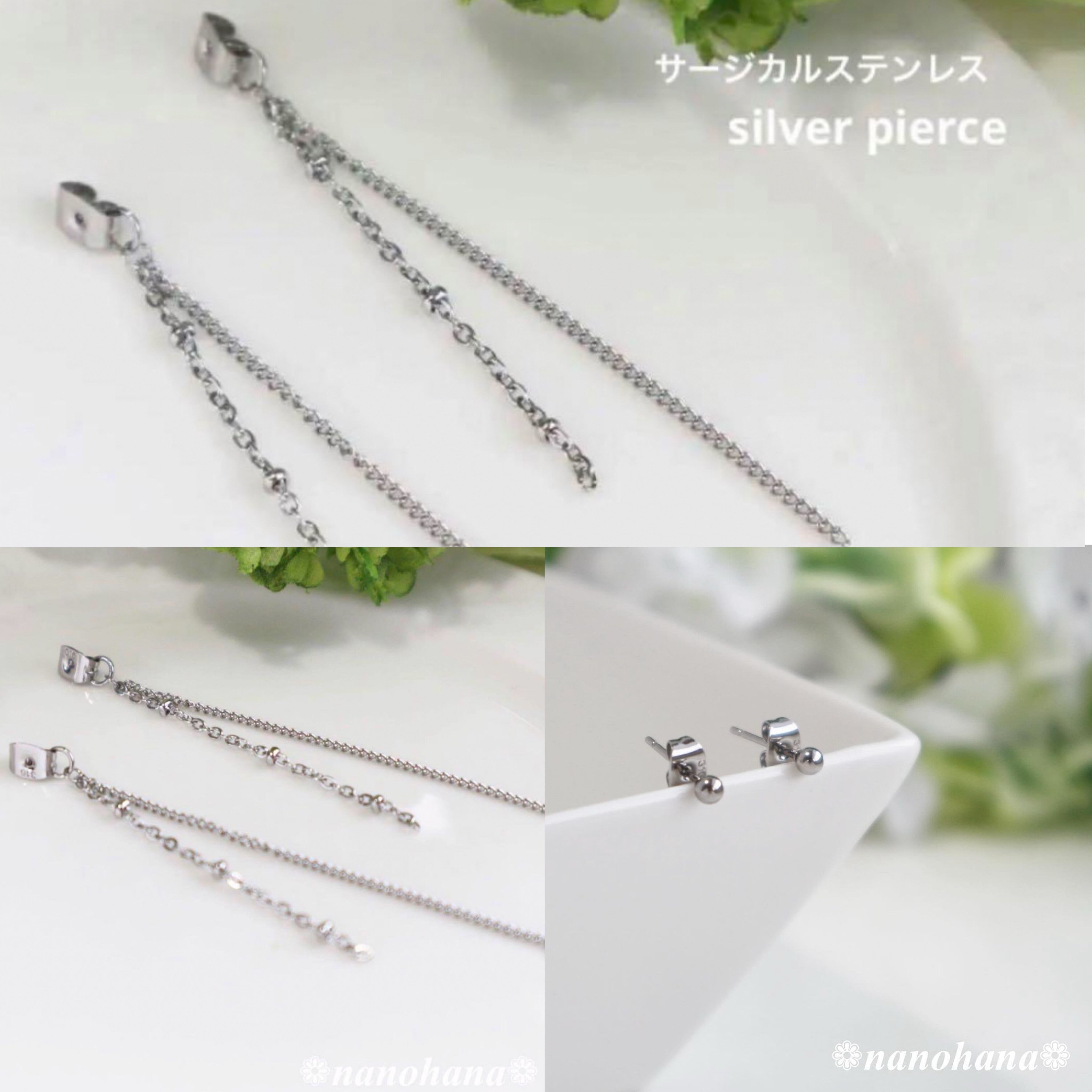 金属アレルギーの方でもお使いいただけるよう全てのパーツ、金具等サージカルステンレス素材を使ったピアスです。