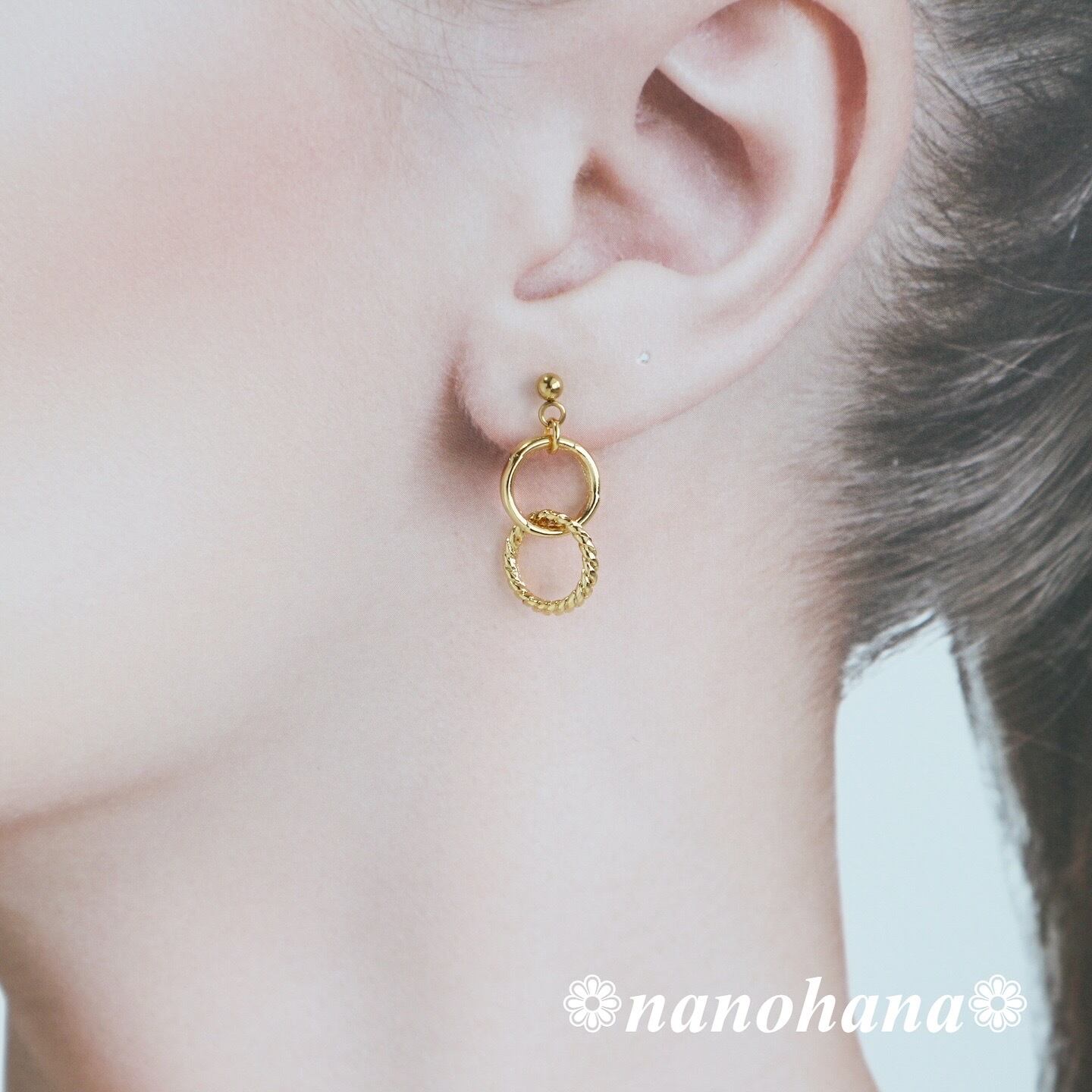 k16gpデザインリングを使ったシンプルでエレガントなデザインが魅力のピアス。ダブルリングチェーン2連ピアス・ゴールドは、シンプルながら存在感のあるデザインが魅力のアクセサリーです。